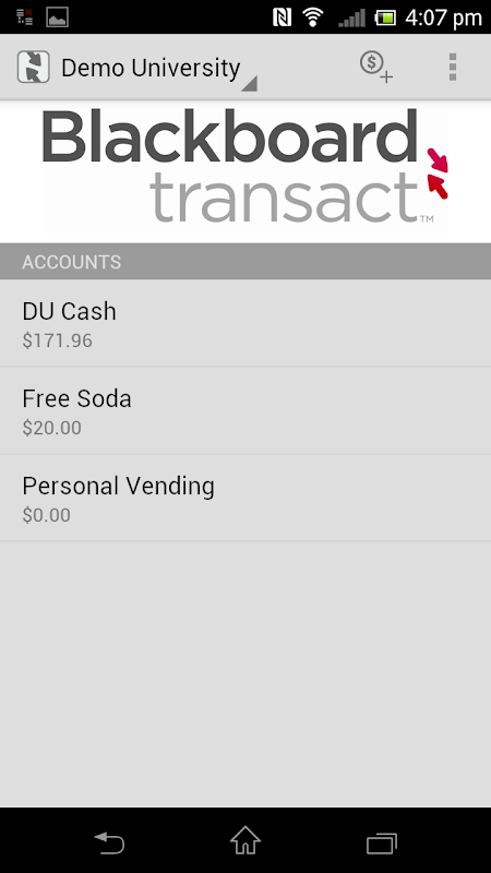 Blackboard Transact Mobile eAccounts application provides quick and easy access to the most popular features of Blackboard Transact eAccounts. Users affiliated with participating institutions can securely manage local campus stored value accounts and ID card status directly through the app. In addition, if enabled, the application can be used as an ID credential to process transactions at NFC capable terminals. Please contact your campus ID card office to verify Bb Transact is supported. A list of campuses currently using Blackboard eAccounts supporting this application is available at http://bbbb.blackboard.com/mobile.
