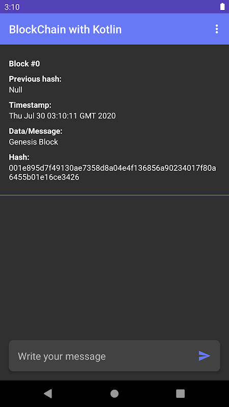 هذا التطبيق المحمول هو مثال لتعلم كيفية عمل Blockchain كتطبيق Android باستخدام Kotlin.