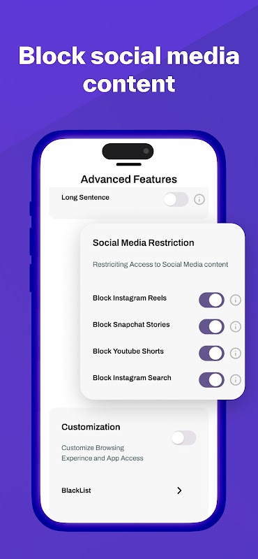 ✅ حظر التطبيقات ومواقع الويب: زيادة الإنتاجية والنمو الشخصي عن طريق حظر التطبيقات المشتتة للانتباه مثل Youtube وInstagram وTelegram وFacebook. تحكم بشكل كامل في تجربتك الرقمية عن طريق إضافة مواقع ويب مخصصة إلى قائمة الحظر.