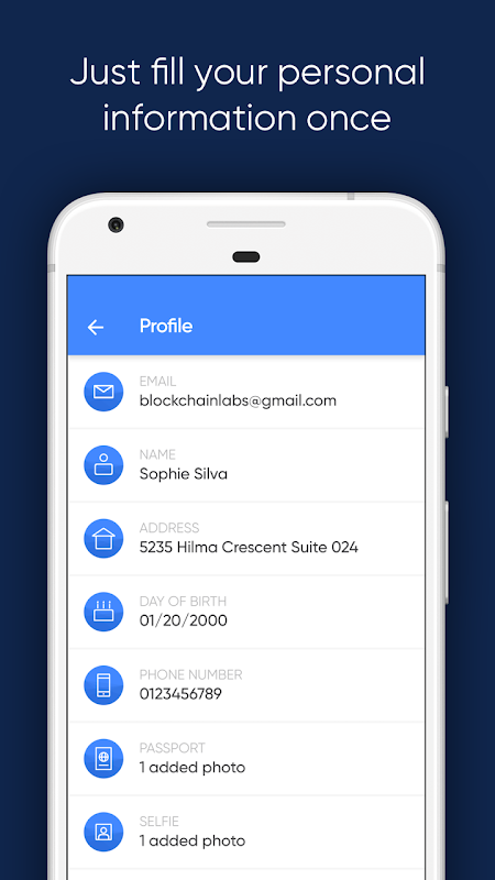 When a user submits identity details and documents to Blockpass for verification, a copy is stored locally and encrypted with a password on the user’s mobile device. The user is the only person who holds the password to decrypt it.