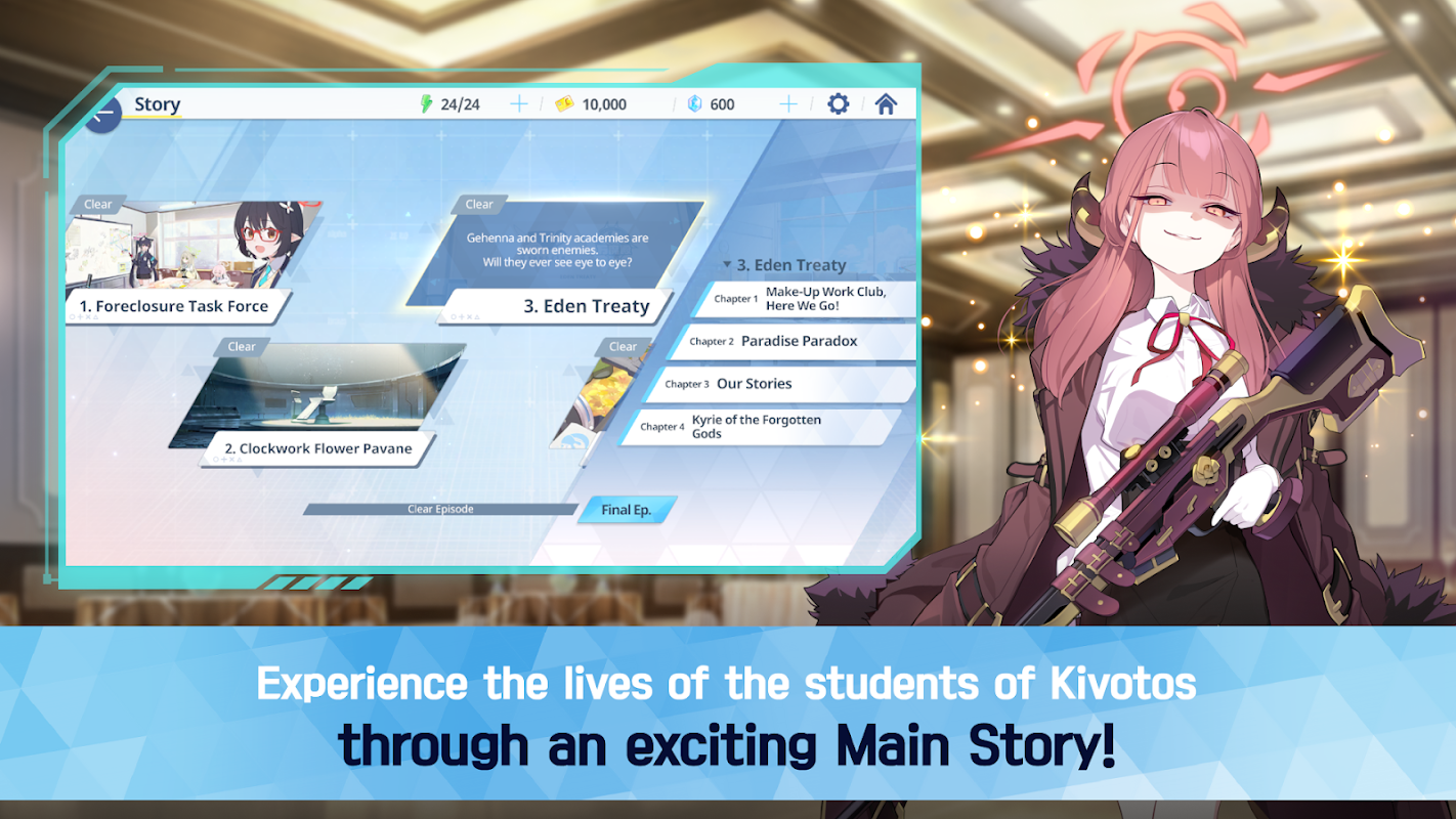 ادخل إلى Kivotos، وستبدأ مغامرتك كمعلم. عِش قصة حب وصداقة مع مشاهد سينمائية رائعة، برسوم متحركة ثنائية وثلاثية الأبعاد. خلال رحلتك، ستلتقي بطالبات هذا العالم وتصادقهن، وتتعرف على قصصهن ودوافعهن الفريدة. تلعب كل فتاة دورًا حيويًا في القصة: بناء روابط قوية، وتشكيل فرق لحماية من يُحببن، وخلق ذكريات دافئة مع المعلم!