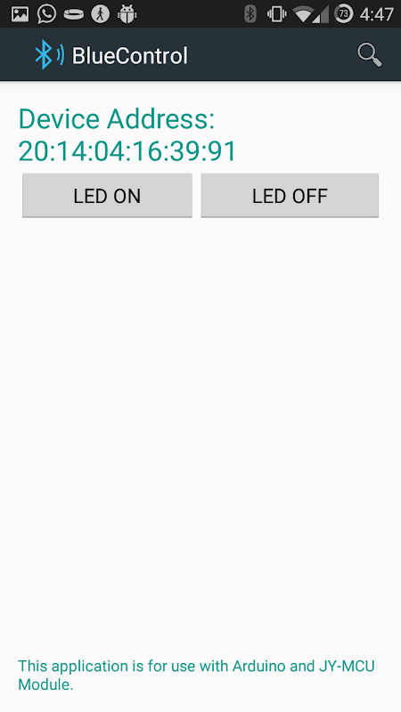 This is simple application is designed to control LED on Arduino via JY-MCU Module. The instruction on how to use the application and setup Arduino is on Instructables.