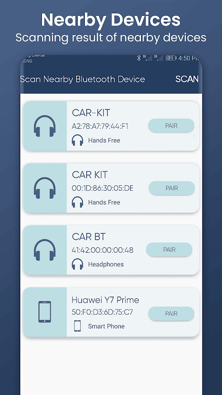 Bluetooth scanner is very helpful to scan all available nearby devices i.e. wireless speaker, earbuds, headset etc. Bluetooth scanner app is a quick and simple app that allow you to manage all your bluetooth pairing problem with great ease. All bluetooth devices finded by bluetooth scanner then you can easily connect with any of the available BT device.