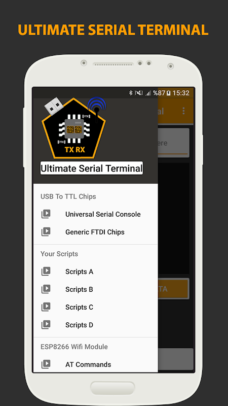 المسلسل التطبيق ميناء محطة لUSB وبلوتوث بنيت في الأجهزة. في وضع SPP USB، ويدعم جميع USB شعبية لرقائق TTL مسلسل مثل: FTDI، CP210X، CH340X وPL230X. جميع البيانات التسلسلية تلقى المعروضة على وحدة التحكم التطبيقات وهو التطبيق مفيدة جدا في التصحيح لتطبيقات الاتصالات التسلسلية مثل إنترنت الأشياء وهلم جرا.
