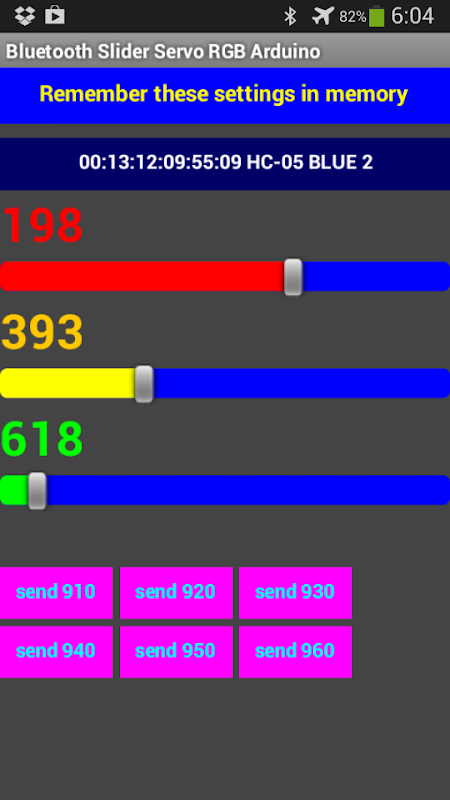 البرنامج لديه ستة أزرار لإرسال عبر بلوتوث قيم مختلفة كأرقام، لمزيد من معالجتها على اردوينو.