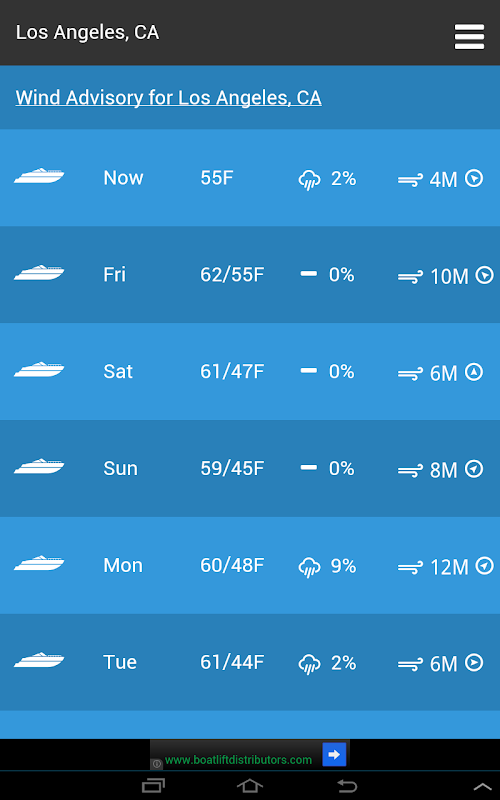 Boating Weather is a simple app used to determine if the weather forecast is good enough to go boating based on your preferences. Set your preferred weather conditions for temperature, rain, wind and a boat icon is displayed if the weather is within those parameters, a house icon is displayed otherwise.