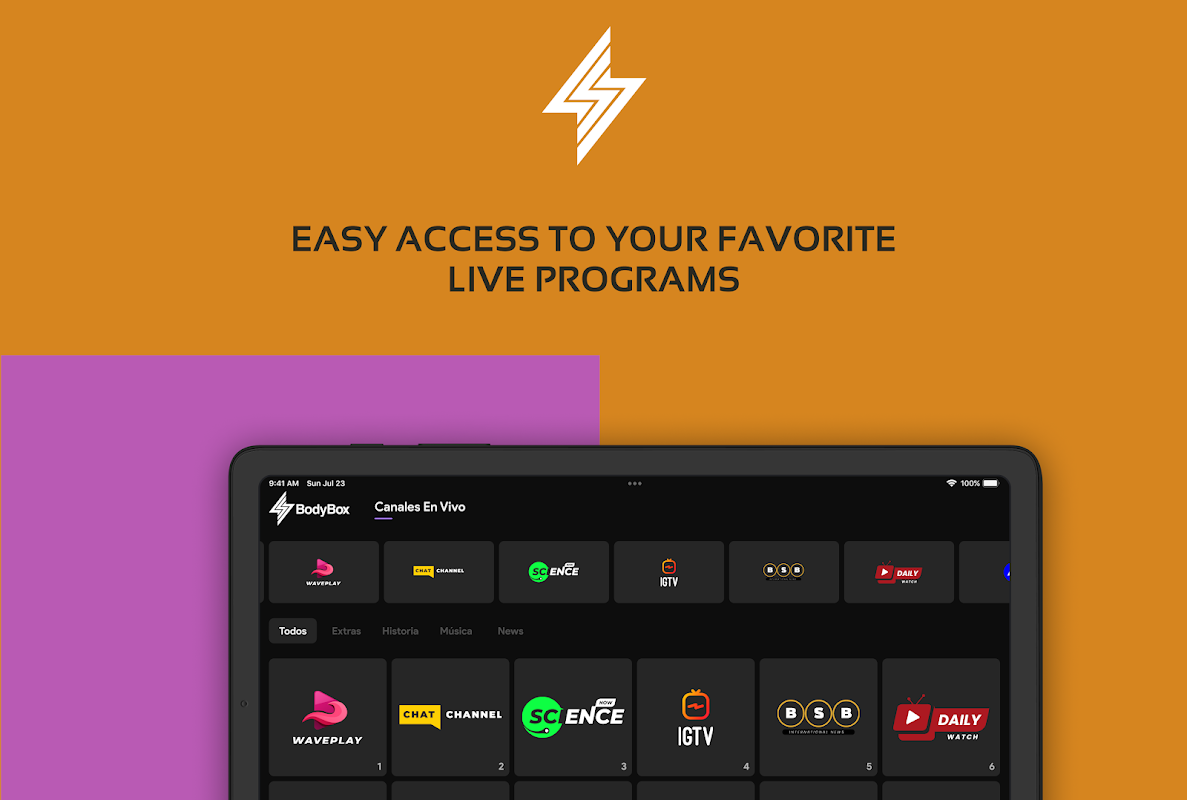 شاهد القنوات المباشرة والأفلام والمسلسلات المختلفة مع تطبيق BodyBox. يمكنك الاستمتاع بها من خلال أجهزة Android الخاصة بك. يحتاج العملاء فقط إلى تثبيت التطبيق ليتمكنوا من الوصول إلى مئات القنوات التلفزيونية أثناء التنقل. شاهد المحتوى المفضل لديك عبر الإنترنت في كل مكان.
