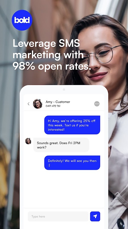 البريد الوارد المركزي لـ Bold يجعل التفاعل مع العملاء أمرًا سهلاً - لا مزيد من تسجيل الدخول إلى منصات متعددة. سواء كانت محادثة بدأت بمكالمة هاتفية أو دردشة عبر الإنترنت، فسوف تتمكن من إتمام المزيد من الصفقات من خلال نظام المراسلة السلس الخاص بنا. إن التفاعل مع عملائك عبر الدردشة عبر الويب يعني أنه يمكنك بدء محادثة على موقع الويب الخاص بك وترجمتها إلى رسائل نصية قصيرة. يمكن تحويل المزيد من العملاء المحتملين إلى عملاء من خلال إنشاء حملات تسويقية متطورة عبر الرسائل النصية القصيرة والبريد الإلكتروني. مع معدل فتح يصل إلى 98%، تعد الرسائل النصية القصيرة هي الطريقة القوية الجديدة لجذب العملاء إلى التفاعل مع عملك. يمكنك أيضًا إرسال طلبات الدفع من هاتفك والحصول على الوظائف مدفوعة الأجر بسرعة - لا مزيد من قضاء ساعات لا حصر لها في الفواتير الصادرة عن برامج المحاسبة.