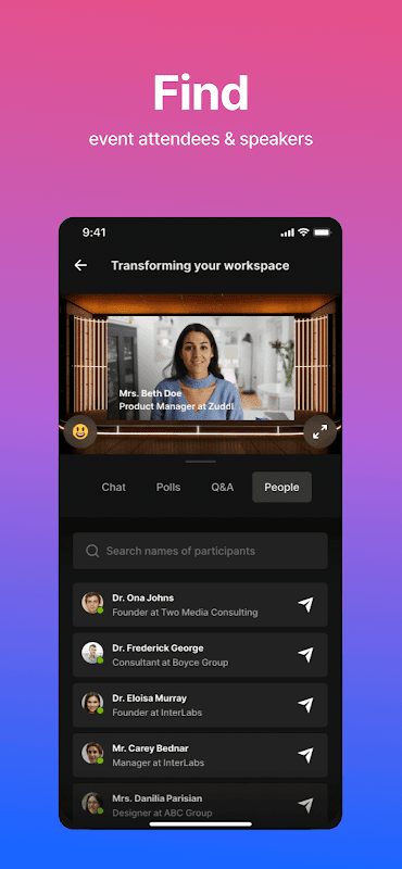 اعرض جميع المشاركين في الحدث وتفاعل معهم عبر رسائل 1 إلى 1.