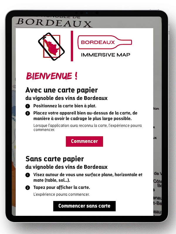 لاستخدام هذا التطبيق، قد يكون من الضروري الحصول على خريطة كرم بوردو بتنسيق ورقي أو رقمي (يمكن تنزيلها أيضًا على جهاز الكمبيوتر الخاص بك: https://www.carte-enrichie.com/bordeaux-immersive-map/).