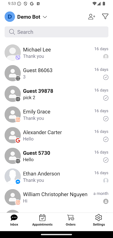وداعًا لمتاعب التبديل بين التطبيقات المتعددة لتفاعلات العملاء. يقوم تطبيقنا بدمج جميع محادثات عملائك من Messenger وInstagram وWhatsApp وViber وTelegram والصوت والرسائل النصية القصيرة في صندوق بريد وارد واحد سلس. قم بالرد على الفور لضمان عدم تفويت أي شيء في خدمة العملاء.
