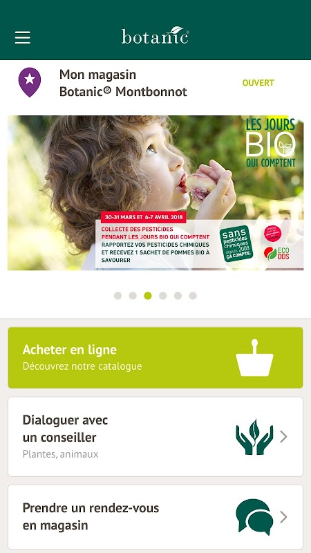 Animations, ateliers, promotions... je reste toujours informé de la vie de mon magasin botanic® et j'accède directement aux informations de mon magasin préféré (horaires d'ouvertures, adresse, numéro de téléphone, itinéraire)
