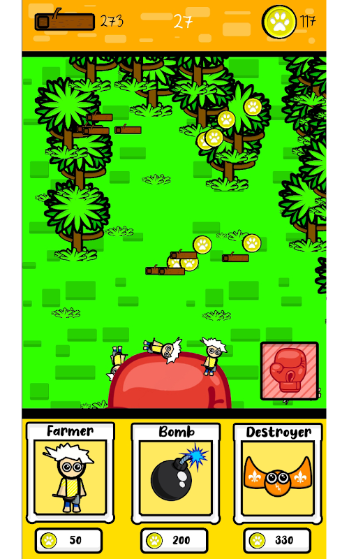the characters jump up and down to break most of the trees you can to collect the amount of wood he asks to finish your game.