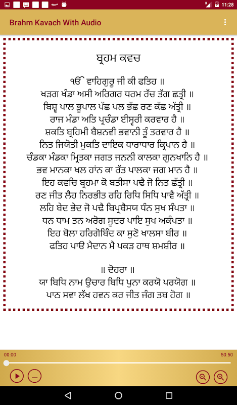 كتب Brahm Kavach من قبل Sri Guru Hargobind Sahib Ji. يوفر Brahm Kavach bani أيضًا الحماية. الغرض من هذا التطبيق هو السماح للجيل الشاب مشغول والمتنقل إعادة الاتصال مع السيخية و Gurubani من خلال قراءة المسار على الأدوات مثل المحمول والأجهزة اللوحية.