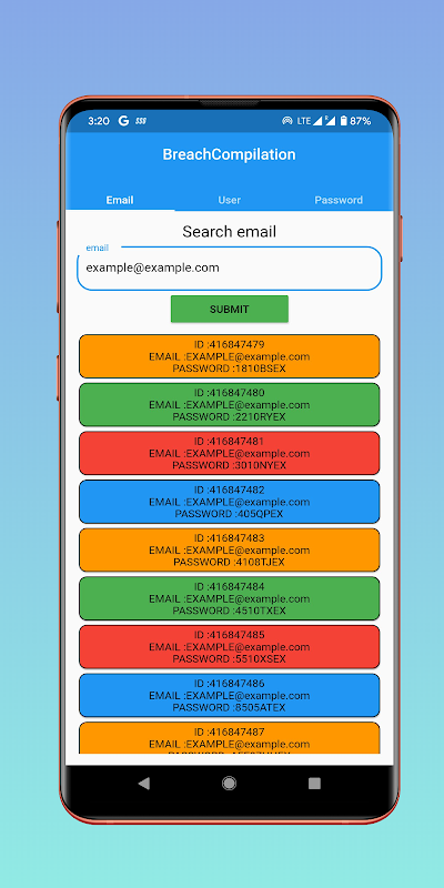 يستخدم هذا التطبيق واجهة برمجة تطبيقات http://pwndb2.herokuapp.com/ للاستعلام عن بيانات BreachCompilation مباشرة في التطبيق.