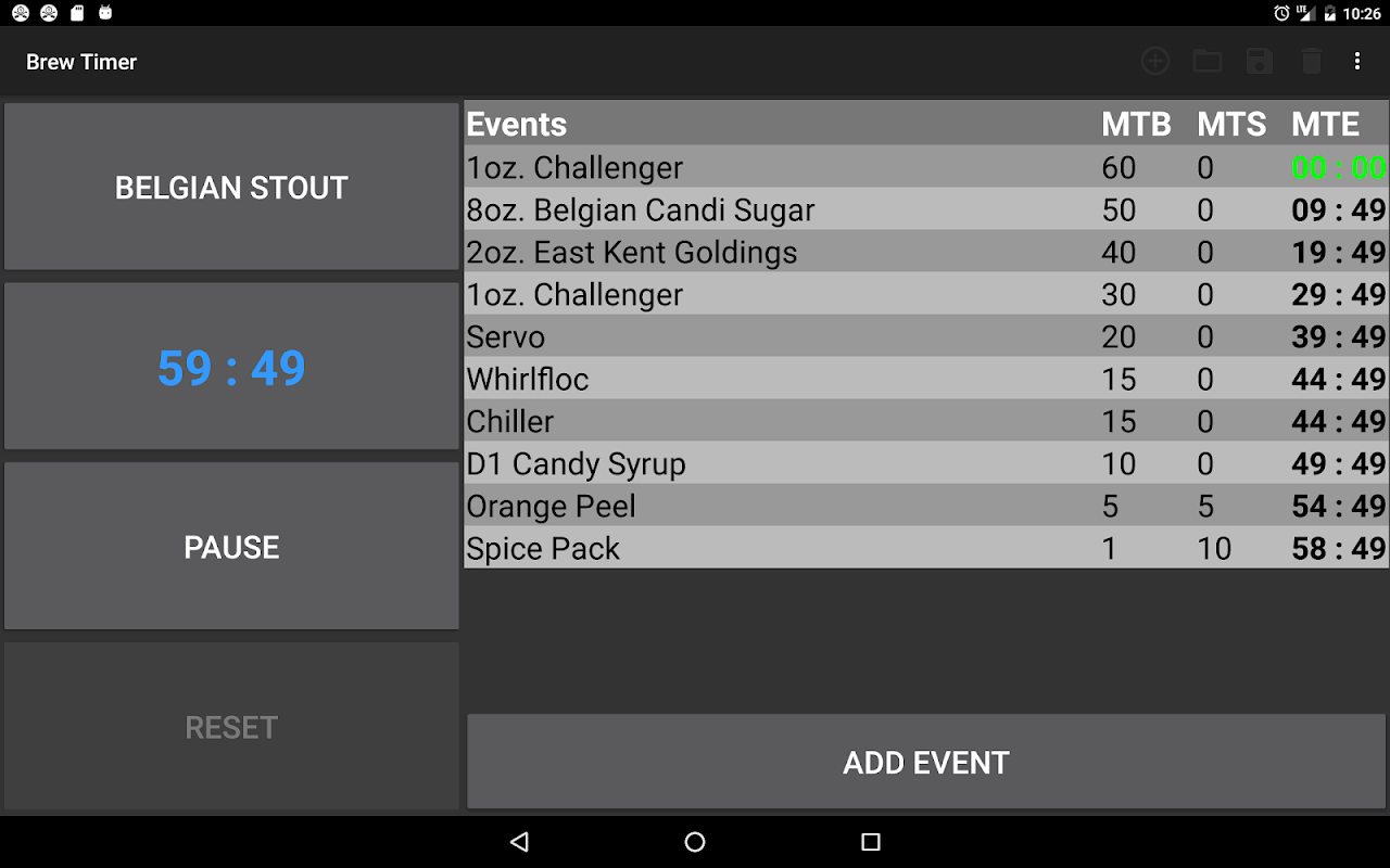 مؤقت الشراب هو لمخمرات، المحترفين والهواة على حد سواء، الذين بحاجة إلى وسيلة أفضل لتتبع الشراب لهم خلال النهار الشراب. تطبيق يسمح للبروير لإنشاء إدخالات الفردية لتوقيت الأحداث تختمر مختلفة مثل إضافة القفزات، والتوابل، لمبرد نبتة، وما يمكن أن تشمل هذه الأحداث أيضا وقت التنقيع بعد الغليان، مما يسمح للمخمرات لتتبع أطوال إضافية من الوقت بعد انتهاء يغلي. هذه الأحداث يمكن تجميعها معا كدورة المشروب ويمكن حفظها على ذاكرة الجهاز في ملف تعريف وصفة التي يمكن بعد ذلك تحميلها عند الحاجة لاستخدامها في المستقبل. يحتوي كل ملف وصفة كل الأحداث اللازمة لجلسة الشراب كاملة.