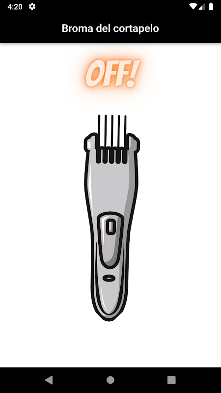 "Broma del cortapelo" es una aplicación de broma que simula el sonido y la vibración de una cortadora de cabello cuando tocas la pantalla. El usuario puede activar o desactivar el efecto cortapelos tocando la pantalla y ver un cambio en la imagen de fondo de la aplicación.