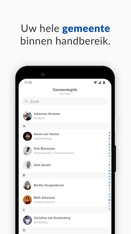 Wie zoekt er tegenwoordig nog een telefoonnummer op in het telefoonboek? Vrijwel niemand! Dankzij de gemeentegids feature is iedereen binnen uw kerkelijke gemeente terug te vinden. Snel berichten sturen, naar een adres navigeren of zien wat iemands rol in de kerk is? Met de digitale gemeentegids wordt het makkelijk.