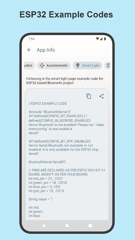 BT Remote Pro app info page has Arduino & ESP32 example codes for quick get started with app joystick, smart light, serial monitor and voice control functionalities.