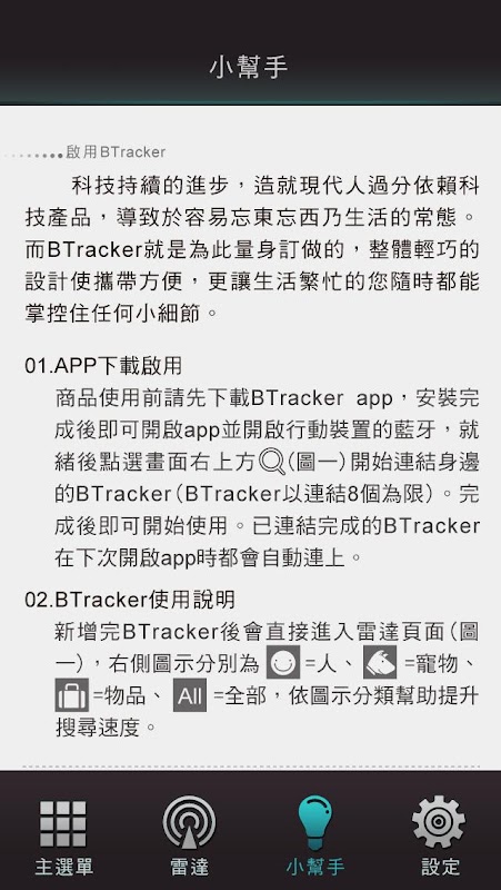 科技持續的進步,造就現代人過分依賴科技產品,導致於容易忘東忘西乃生活的常態。而BTracker就是為此量身訂做的,整體輕巧的設計使攜帶方便,更讓生活繁忙的您隨時都能掌控住任何小細節。