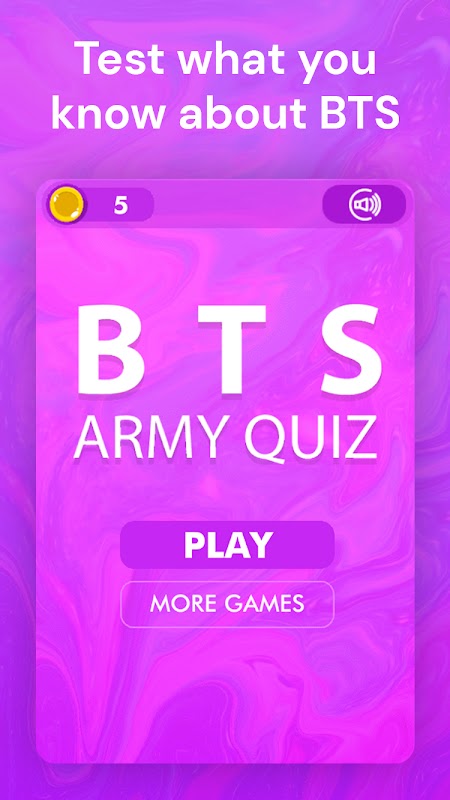 This application has several levels and game modes: Guess the BTS Idol - Guess the BTS song by MV - Questions about BTS members.