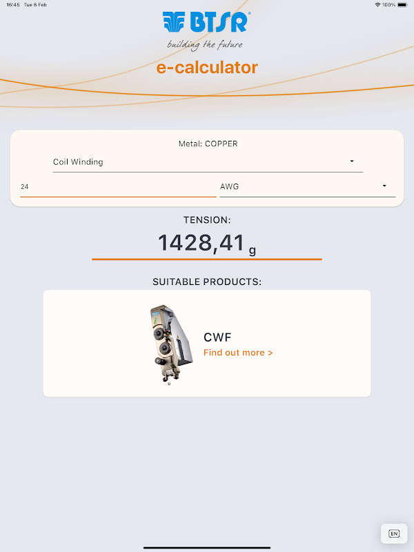 يسمح BTSR E-Wire Calc بحساب شد السلك الاسمي للنحاس المطلي / الألومنيوم وفقًا لقطر السلك (مم أو AWG). يقترح هذا التطبيق أيضًا جهاز BTSR الأكثر ملاءمة لاستخدامه في معالجة قطر السلك المحسوب