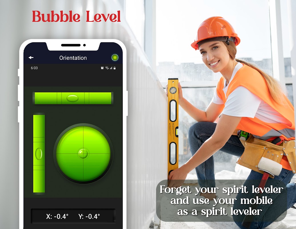 مقياس مستوى الروح مثالي لقياس الإمالة ومستوى السطح. باستخدام تطبيق مستوى الفقاعة ، امسك هاتفك المحمول بشيء أو ضعه على سطح مستو. مقياس مستوى الماء سهل الاستخدام ، لذا لن تضطر إلى حمل مقياس مستوى المياه معك طوال الوقت. يمكنك استخدام تطبيق مستوى الفقاعة هذا في الرافعات المتنقلة وأعمال البناء لقياس زوايا أداة مستوى السطح. أداة قياس المستوى فقط ضع هاتفك على الحائط وتأكد من أن الفقاعة تنتقل في الموضع المركزي. يتم استخدام فقاعة مقياس المستوى لتحديد الاتجاه. مستوى الروح هو تطبيق مصمم للتحقق من أداة مستوى السطح الأفقي. يحتوي مستوى الفقاعة هذا بجانب مستوى القياس الكلاسيكي على خيار المعايرة.