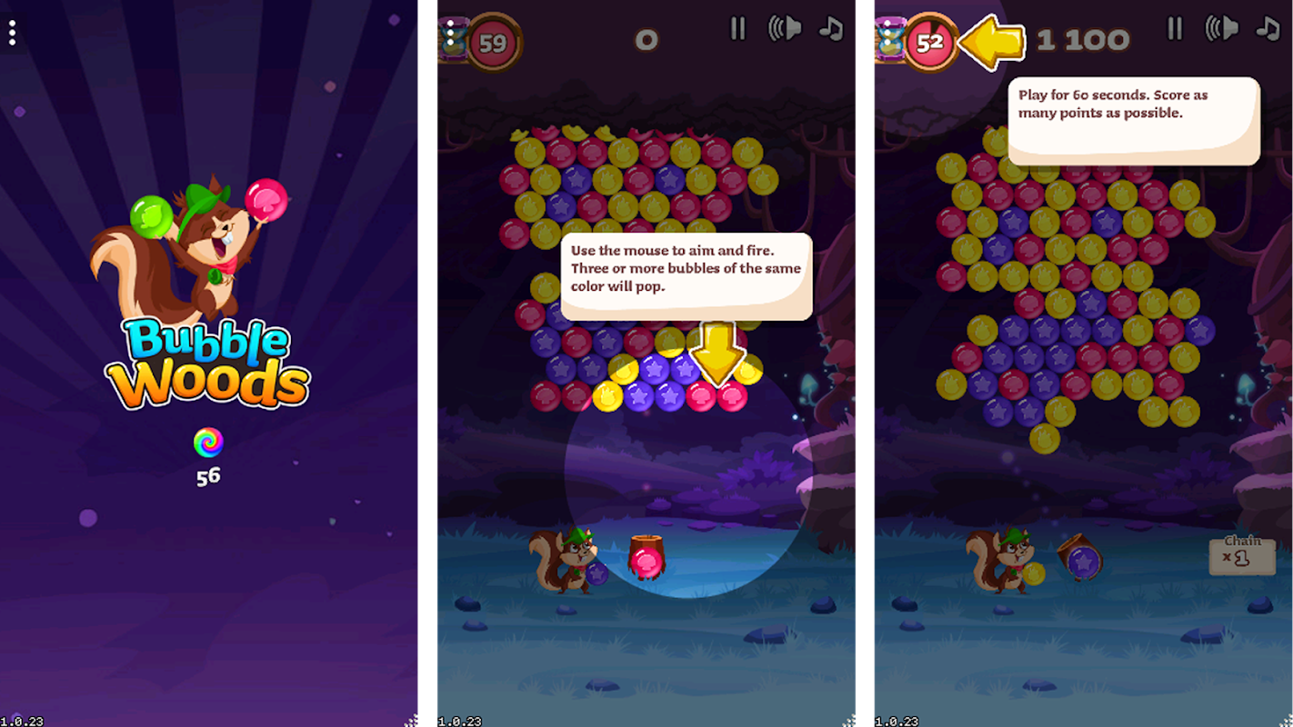 Although it may look adorably cute, Bubble Woods is a thrilling high score game experience. In 60 second rounds your only goal is to reach the highest score possible. Shoot the biggest clusters, use super effective power-ups, play strategically and be quick. This is not your average bubble shooter, this is Bubble Woods!