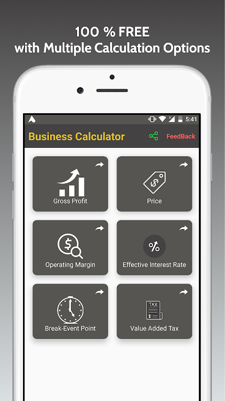 Business Calculator هو تطبيق ممتاز لحساب القيم مثل نسبة الهامش ، نسبة العلامات ، معدل المبيعات ، معدل النسبة المئوية ، سعر التكلفة ، سعر البيع ، إلخ. إنه أداة مفيدة للطلاب والمبيعات ورجال الأعمال.