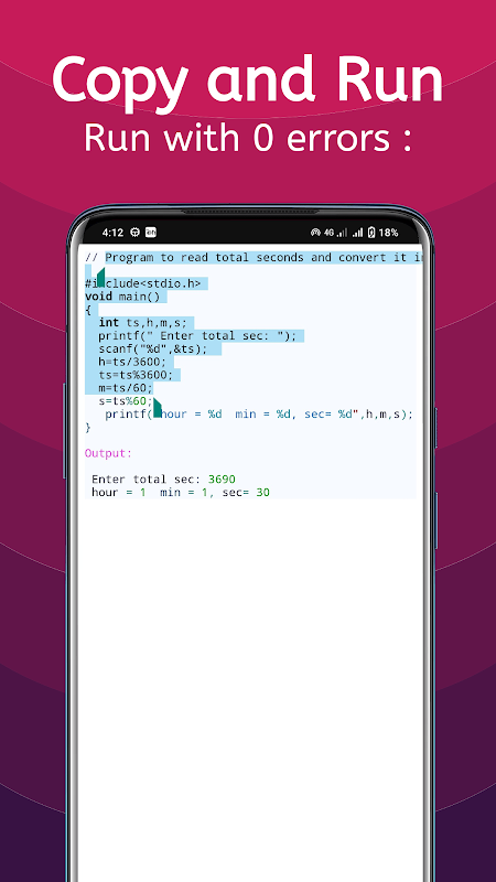 لجعل تعلم البرمجة بلغة C أكثر إثارة للاهتمام ، يوفر التطبيق العشرات من الأمثلة العملية التي يمكنك تحريرها وتشغيلها على البرمجة C