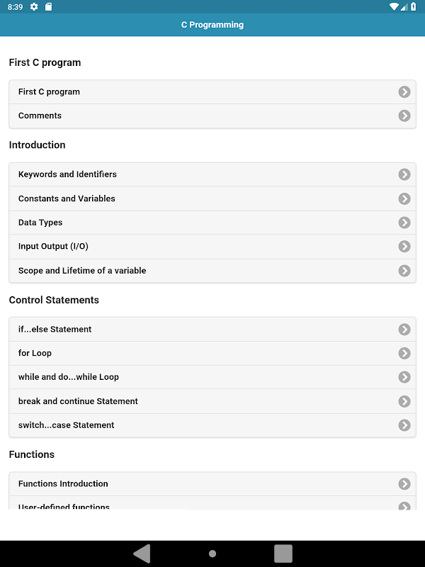 من هذا التطبيق ، ستتمكن أيضًا من معرفة كيفية تشغيل البرنامج c على مختلف أنظمة التشغيل مثل Android أو Windows أو Mac أو Linux. واجهة مستخدم بسيطة جدا ويمكنك فهم محتويات بسهولة. وأضاف الصور الأساسية. يمكنك الآن تعلم البرمجة C باستخدام جهاز Android. هذا التطبيق يحتوي على: