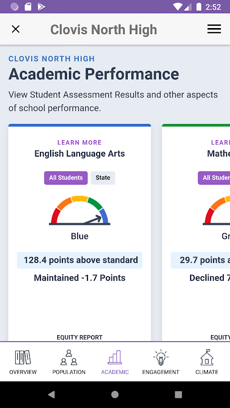 يستطيع سكان كاليفورنيا استخدام تطبيق CA Dashboard للهاتف المحمول للوصول بسهولة إلى المعلومات بناءً على California School Dashboard. Dashboard هو نظام المساءلة الجديد في كاليفورنيا ويساعد الآباء والمعلمين على تحديد مواطن القوة ومجالات التحسين. من خلال لوحة المعلومات ، تبلغ كاليفورنيا عن كيفية أداء المقاطعات والمدارس (بما في ذلك المدارس البديلة التي تخدم الطلاب المعرضين لمخاطر عالية) والمجموعات الطلابية عبر تدابير الولاية والاستجابة لتدابير المؤشرات المحلية.