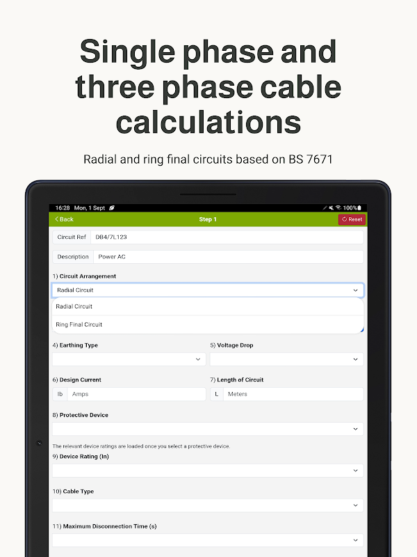 حاسبة لحجم الكابلات، مبنية على المعيار BS 7671، لحساب الدوائر الشعاعية أحادية الطور وثلاثية الطور، والدوائر الحلقية النهائية أحادية الطور.