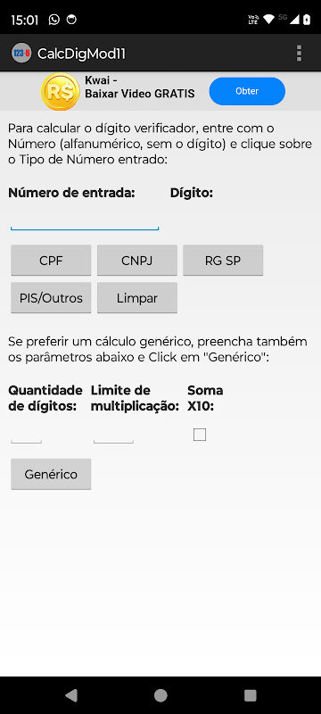 يتيح لك هذا التطبيق حساب أرقام التحقق من الأرقام الأبجدية الرقمية باستخدام طريقة الوحدة 11. يتم حساب أرقام التحقق من CPF وCNPJ وRG SP وPIS وغيرها، مثل بعض الحسابات المصرفية، باستخدام هذه الطريقة.