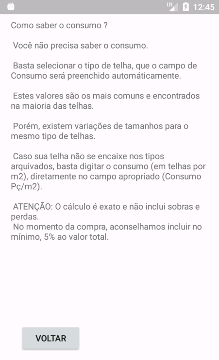 O aplicativo possui um cadastro, com vários tipos de telhas e seus respectivos consumos, por metro quadrado.