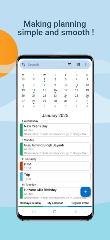 الأحداث المتكررة: قم بإعداد الأحداث المتكررة بسهولة، سواء كانت يومية أو أسبوعية أو شهرية. رائعة للاجتماعات أو المواعيد أو المهام العادية.