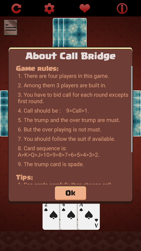 Call bridge is a game of tricks, trumps and bidding which is popular in Bangladesh. It seems to be related to the North American game Spades. The rules vary from place to place, and several of these alternatives are described in the variations section.
