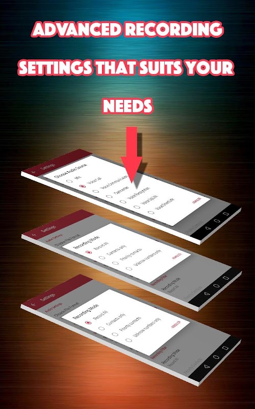 وضعنا أفضل ميزة في هذا التطبيق الذي يسمح لك لتسجيل المكالمات في ثلاثة أشكال مختلفة تريد، إذا كنت تريد حفظ نوع الملف الخاص بك في 3GP، MP4، عمرو أو WAV يمكنك تحديده يدويا. استخدم المكالمة مسجل الموالية الميزة المدهشة التي تسمح لك لتحديد مصدر تسجيل الصوت. أيضا تعيين إخطارا من تسجيل المكالمات التي إعلامك في حين تم تسجيل. في هذا مسجل المكالمات المجانية جميع المكالمات التطبيق قمنا بإضافة ميزة للمحترفين والذي يسمح لك لتبادل مكالمتك تسجيل مع أي شخص عبر الفيسبوك، ال WhatsApp، سكايب أو أي برمجيات الشبكات / وسيلة اتصال أخرى. اختر المكالمات المسجلة عن طريق التمرير إلى أسفل من خلال أسماء جهات الاتصال أو الرقم الذي كنت لا تعرف.