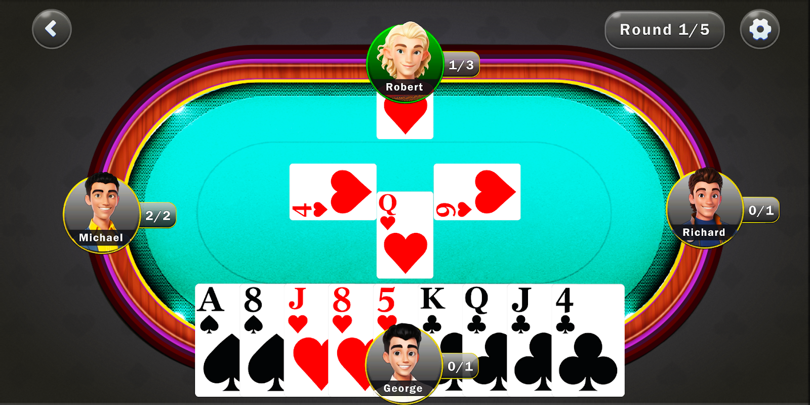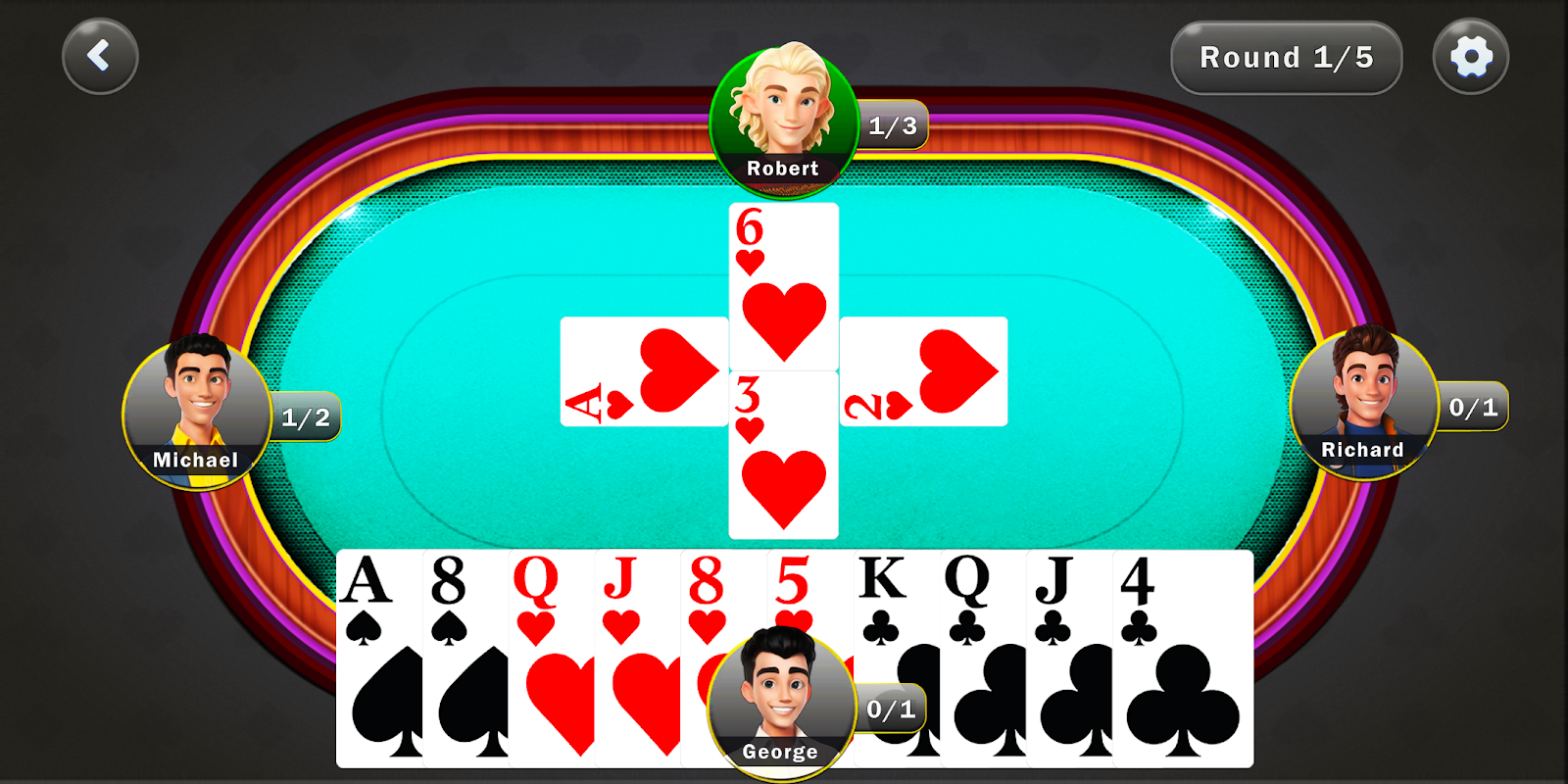 انغمس في عالم Callbreak بقواعده التقليدية التي تحبها. العب لعبة الورق المشابهة لـ tash ka وtaas pati، كما لو كنت تلعب بمجموعة أوراق لعب.