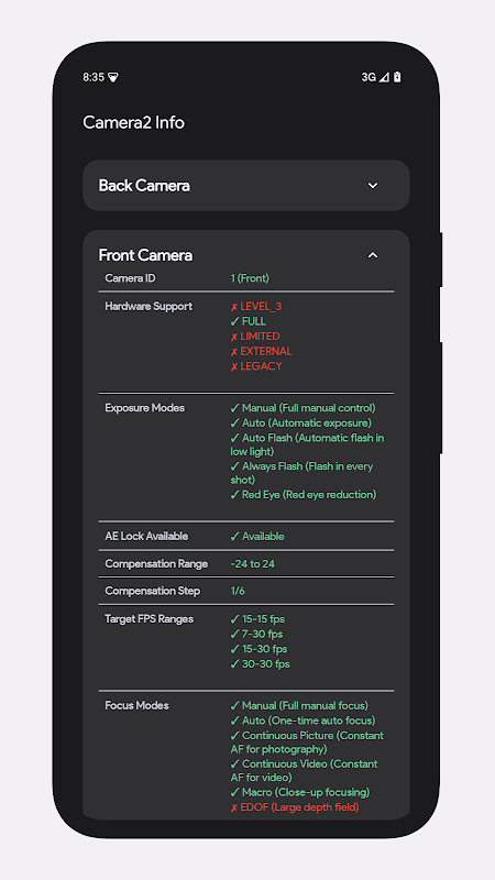 مع تطور نظام كاميرا Android، أصبحت Camera2 API ضرورية للتطبيقات التي توفر عناصر تحكم يدوية في الكاميرا والتقاط صور RAW وخيارات التركيز/التعرض المتقدمة. ومع ذلك، لا تدعم جميع أجهزة Android مجموعة كاملة من الميزات. تكشف معلومات Camera2 ما يدعمه جهازك بالضبط — على الفور.