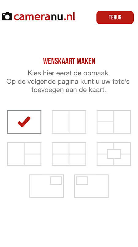 Daarnaast biedt de App de mogelijkheid om met je eigen foto’s kaarten te ontwerpen en te versturen. Ideaal voor tijdens vakanties, Valentijn, verjaardagen of kerstmis. Je kan natuurlijk ook zomaar iemand een kaartje sturen! Maak een keuze uit één van de acht layouts, kies je foto’s uit en voer je persoonlijke boodschap in op zowel de voor- als achterzijde van de kaart. Wij drukken de kaart met een professionele digitale HP Indigo drukpers en brengen een lamineer laag aan zodat de kaart altijd mooi blijft.