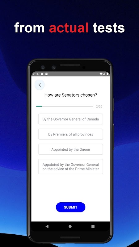 يحتوي على 200 سؤال من اختبارات الجنسية الكندية الحقيقية. تعرف على تاريخ كندا وقيمها وحكومتها ورموزها. تستند جميع المواد إلى موقع اكتشف كندا: حقوق ومسؤوليات المواطنة. تدرب على الأسئلة التي ستطرح عليك في اختبار الجنسية. يتميز هذا التطبيق بوضع الاختبار الذي يحاكي بيئة الاختبار. سوف تحصل على ملاحظات فورية على إجاباتك الصحيحة وغير الصحيحة. لا يلزم الاتصال بالإنترنت ، يمكنك التحضير لاختبار الجنسية الكندية في أي مكان وفي أي وقت.