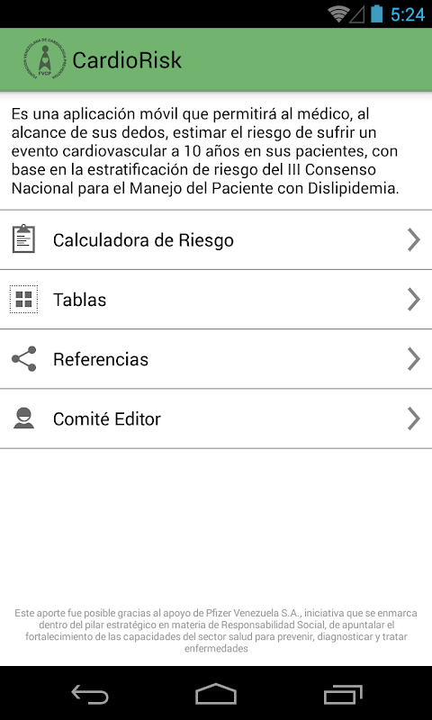 “CardioRisk” es una aplicación para dispositivos móviles que fue diseñada por cuenta y orden de la “Fundación Venezolana de Cardiología Preventiva” (FVCP) con el apoyo de Pfizer en el marco de las iniciativas de educación médica continua. Dicha aplicación esta destinada sólo y exclusivamente para el uso de los médicos dentro de la República Bolivariana de Venezuela. El objetivo de dicha aplicación es ofrecer a los médicos, una herramienta de fácil manejo para el cálculo de riesgo cardiovascular de sus pacientes a fin de establecer la estrategia terapéutica más conveniente para reducirlo; con base en la información contenida en el “III Consenso para el Manejo del paciente con Dislipidemia”.
