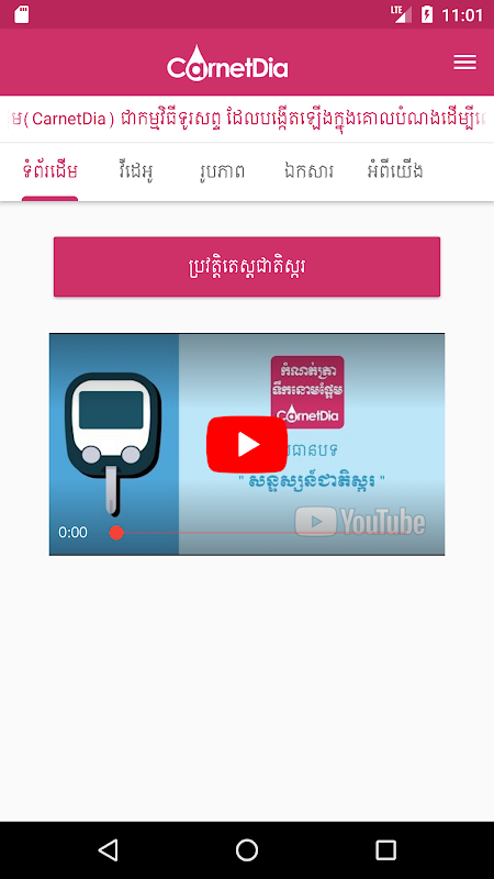 تتمثل رؤيتنا في زيادة وعي الشعب الكمبودي بمرض السكري. CarnetDia هو دفتر ملاحظات رقمي. وفي CarnetDia ، توجد مقاطع فيديو وصور ووثائق تتعلق بمرض السكري ، تم تصميمها خصيصًا وفقًا للسياق الاجتماعي والثقافي الكمبودي.