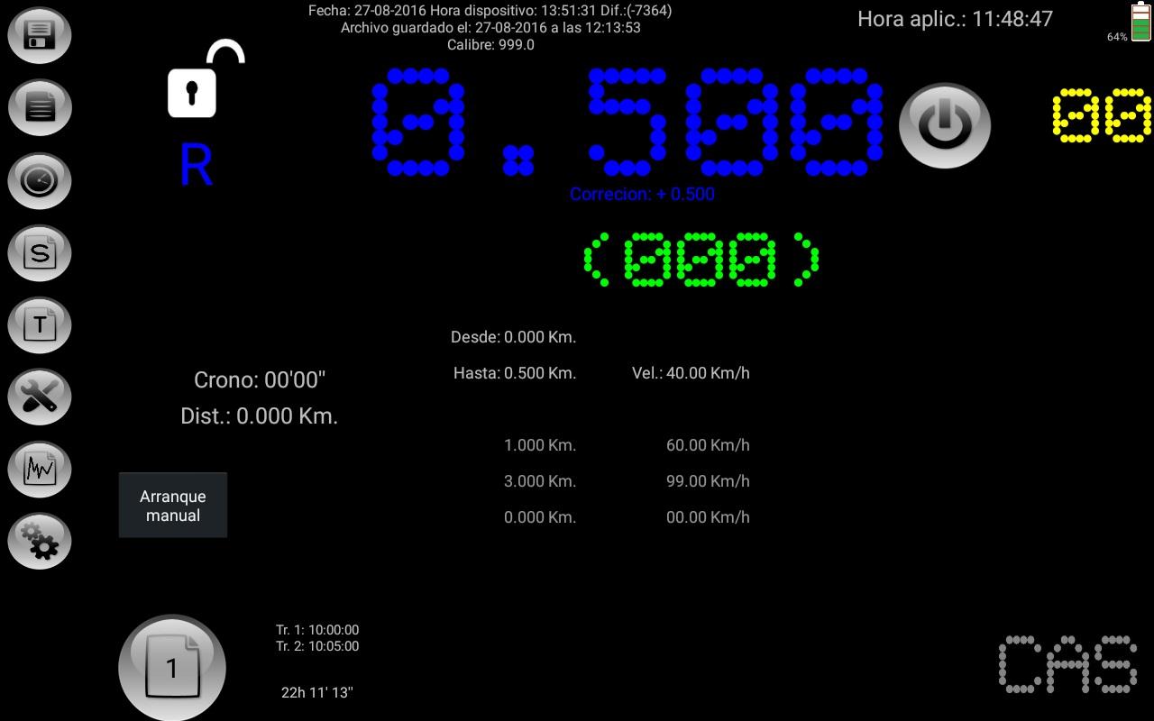 Cuenta con el menu "Tablas" para calcular los tiempos estimados a las proximas distancias, siendo ajustables las decenas de metros y tambien las distancias estimadas en los proximos tiempos.