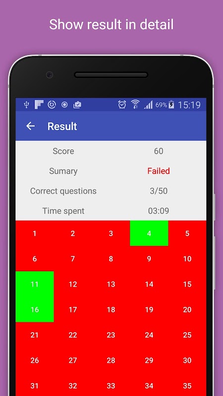 - وضع الممارسة يتكون من العديد من الأسئلة. يمكن للمستخدم معرفة الجواب الصحيح والتفسير.