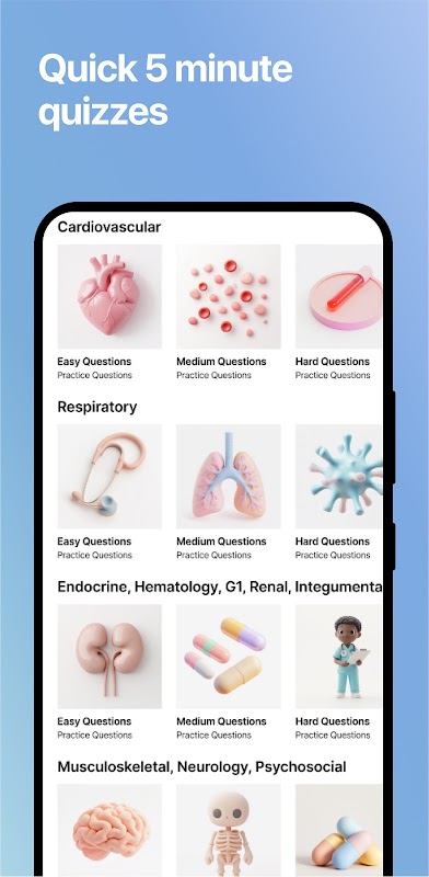 يتم تقسيم كل قسم من أقسام اختبار CCRN إلى اختبارات تدريبية بناءً على دليل الدراسة الرسمي. ادرس موضوعات مثل أمراض القلب والأوعية الدموية والرئة والغدد الصماء والجهاز الهضمي والجهاز العصبي والمزيد.