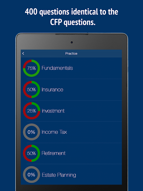 CFP practice exam simulator is a free cfp exam prep app, study guide and cfp review for Certified Financial Planner examination. It is a complete CFP Review and study guide to prepare you for actual cfp exam by taking CFP practice exam , studying CFP flashcards and mock test. This application is designed to take CFP practice exam questions on the go without internet on your mobile device. CFP practice exam prep app record you performance, gives a comprehensive cfp review and highlight the weaker area to let you focus on them while studying for Cfp exam questions. All questions are formulated by experts closer to the actual Cfp exam questions.