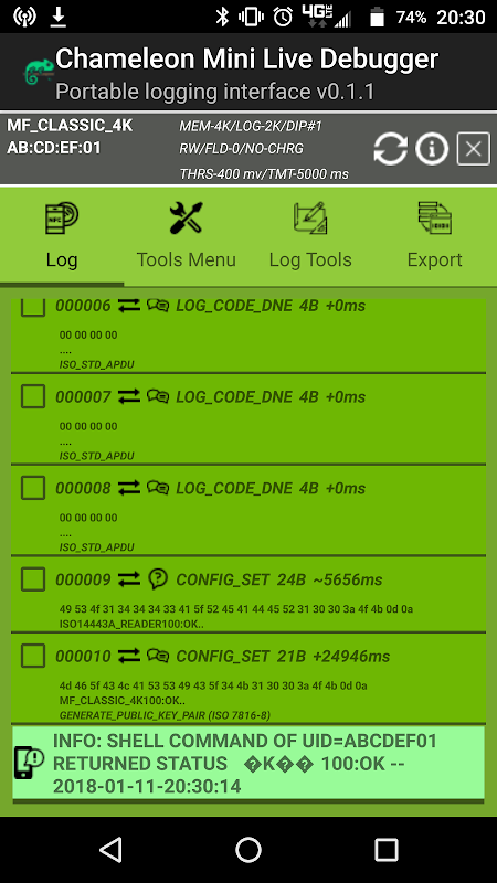 الحرباء البسيطة هي أداة الأجهزة لتصحيح الأخطاء NFC، مضاهاة بطاقة، اختبار الأمن والاستطلاع، وتصحيح الأخطاء الغرض العام على هذه الواجهة. هذه الأجهزة محاكي NFC صغيرة بحجم بطاقة قادرة على استنساخ بطاقات الاتصال أقل وتتفاعل به وشم البيانات مؤطرة RF الخام التي يتم إرسالها عبر واجهة دون النفقات العامة من كومة NFC باهظة الروبوت. الإصدارات الأخيرة من لوحات الحرباء (القس> = ز) لديها خيار لأداء * * تسجيل العيش مع الجهاز حيث يتم طباعة سجلات الخام إلى وحدة التحكم في الوقت الحقيقي. يوفر هذا التطبيق واجهة محمولة لاستخدامها مع ميزات تسجيل حية للجهاز على الذهاب والشبح NFC قارئ بطاقة التصحيح والاختبار.