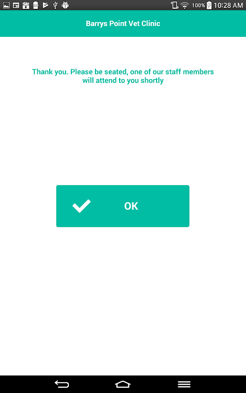مع تطبيق CheckLink ، يمكن للعملاء الذين يزورون عيادة Vet Clinic تسجيل الوصول الذاتي ، إذا كان لديهم موعد. سيتم إبلاغ الموظفين بوصول العميل بمجرد الانتهاء من تسجيل الوصول.